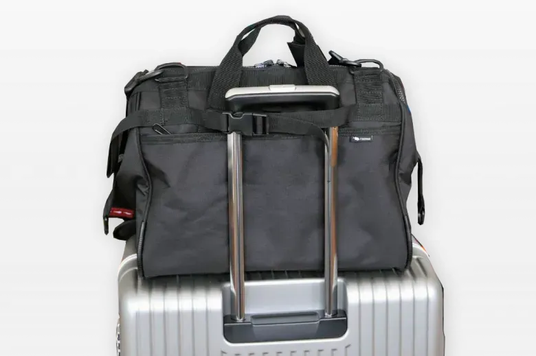 The back of the bag has a band for the carry case. The bag can be fixed to the carry case to make it one piece.