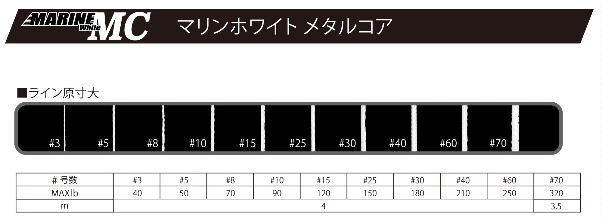 Marine White MC (Marine White Metal Core): A special soft stainless steel wire is used for the core, realizing a metal core assist line that can be tied directly. Assist lines can be assembled with knots without using wire sleeves. A must have when targeting sharp-toothed fish such as hairtail and Spanish mackerel. It can also be used as a mainline leader due to its flexibility and bundling ability.